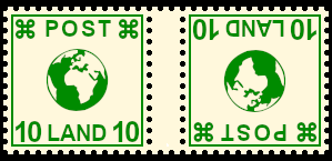 Zusammendruck mit steh-endem und kopfstehendem Briefmarkenaufdruck: Einheit bei der durch eine Fehlleistung eine Briefmarke mit einem steh-enden und die andere mit einem kopfstehenden Briefmarkenauf-druck versehen wurde |
