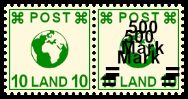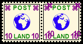 Zusammendruck mit einfach-em und doppeltem Brief-markenaufdruck: Einheit bei der durch eine Fehlleistung eine Briefmarke mit einem einfachen und die andere mit einem zwei-fachen Briefmarkenaufdruck versehen wurde |