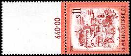 gezähnter Briefmarkenbilddruck mit Zierfeld ohne Trennungshilfe zwischen den Bogenfelder: Zweierstreifen Bilddruck mit Zierfeld mit Zähnung die als beabsicht-igte Ausführung zwischen den Bogenfelder mit keiner Trennungshilfe versehen wurde |