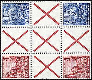 Zusammendruck mit schachbrett-artigem Briefmarkenaufdruck: Einheit bei der als beabsichtigte Ausführung nur jede zweite Briefmarke mit einem Briefmarken-aufdruck versehen wurde |