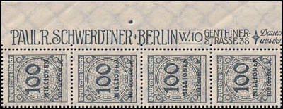 Zusammendruck Briefmarkenbilddruck mit Reklamefeld: Einheit bei der als beab-sichtigte Ausführung ein Bogenfeld mit einem Briefmarkenbilddruck und das andere mit Werbung bedruckt wurde |