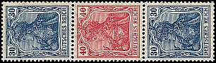 Triptychonzusammendruck: Einheit bei der als beabsichtigte Ausführung die mittlere Briefmarke nach oben versetzt ist (griechisch = dreiteiliger Altaraufsatz) |