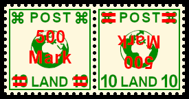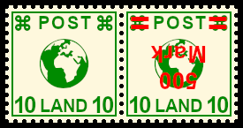 Zusammendruck mit fal-schem kopfstehendem und ohne Briefmarkenaufdruck: echter Zusammendruck bei dem in betrügerischer Absicht eine Briefmarke mit einem um 180 Grad gedrehten falschen Brief-markenaufdruck versehen wurde |