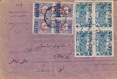 Postal order (5000 Piaster) from 02.08.1919 from Adana franked with 4 postage stamps a 1 Piaster with Large block stamp and 4 postage stamps a 5 Piaster with typographed overprint