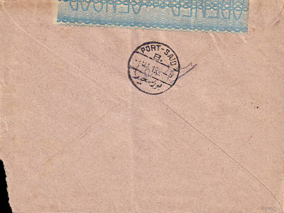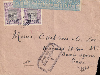 Foreign cover from 25.04.1919 from Mersina to Cairo (Egypt) with green censorship strip and front censorship stamp, franked with two postage stamps a 1 Piaster each with Large block stamp