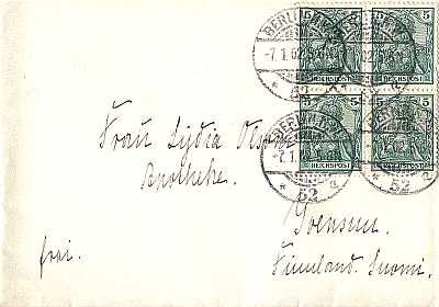 Auslandsbrief (1-20 g) vom 07.01.1902 frankiert mit 4 Marken a 5 Pfennig (=20 Pfennig) |