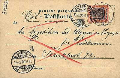 Inlandspostkarte mit Eilzustellung vom 13.11.1900 frankiert mit einer Marke a 30 Pfennig (=30 Pfennig, 5 Postkarte 25 Eilzustellung) |