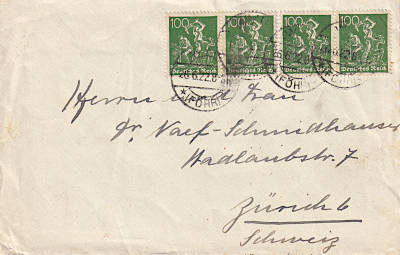 Foreign cover (1-20 g) from 26.06.1922 (7. Period) franked with 4 stamps a 100 Pfennig (=4 Mark) |