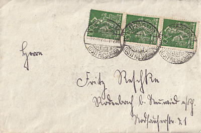 Inland cover (1-20 g) from 14.08.1922 (8. Period) franked with 3 stamps a 100 Pfennig (=3 Mark) |