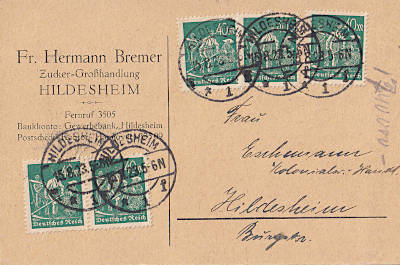 Inland postcard from 18.07.1923 (14. Period) franked with 3 stamps a 40 Mark (=120 Mark) |