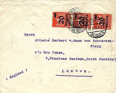Auslandsdrucksache (1-50 g) vom 19.09.1923 (17. Periode) frankiert mit 2 Marken a 20 000 Mark auf 12 Mark (=40 000 Mark) |