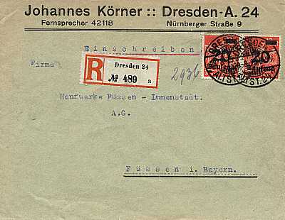 Inlandsbrief mit Einschreiben (1-20 g) vom 28.08.1923 (16. Periode) frankiert mit 2 Marken a 20 000 Mark auf 12 Mark (=40 000 Mark, 20 000 Brief 20 000 Einschreiben) |