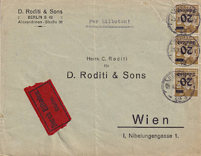 Foreign cover with special delivery (1-20 g) from 25.08.1923 (16. Period) franked with 3 stamps a 20 000 Mark on 25 Mark (=60 000 Mark, 20 000 cover 40 000 special delivery); to Austria the inland fee was valid |