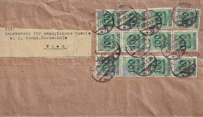 Foreign printed matter (51-100 g) from 06.10.1923 (19. Period) franked with 12 stamps a 100 000 Mark on 400 Mark (=1,2 Million Mark); to Austria the inland fee was valid |