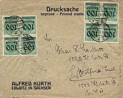 Inland printed matter (1-25 g) from 06.10.1923 (19. Period) franked with 4 stamps a 100 000 Mark on 400 Mark (=400 000 Mark) |