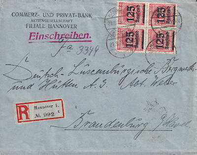 Inland cover with registeration (1-20 g) from 21.09.1923 (18. Period) franked with 4 stamps a 125 000 Mark on 1 000 Mark (=500 000 Mark, 250 000 cover 250 000 registeration) |