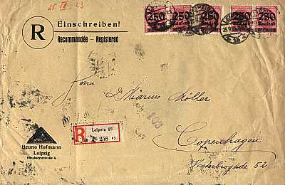 Inland cover with registeration (1-20 g) from 22.09.1923 (18. Period) franked with 2 stamps a 250 000 Mark on 500 Mark (=500 000 Mark, 250 000 cover 250 000 registeration) |