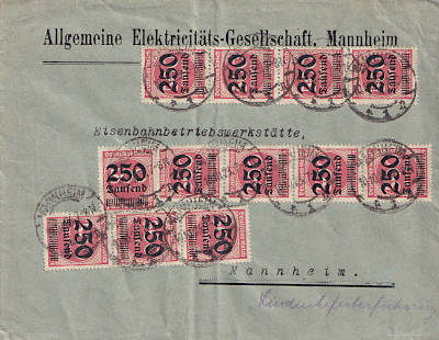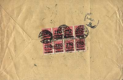 Inland cover (1-20 g) from 01.10.1923 (19. Period) franked with 8 stamps a 250 000 Mark on 500 Mark (=2 Million Mark) |
