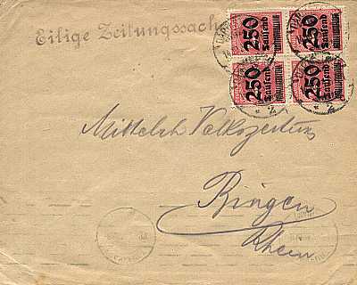 Inland printed matter (1-25 g) from 14.10.1923 (20. Period) franked with 4 stamps a 250 000 Mark on 500 Mark (=1 Million Mark) |