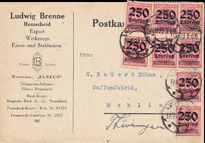 Inland cover (1-20 g) from 26.09.1923 (18. Period) franked with one stamp a 250 000 Mark on 500 Mark (=250 000 Mark) |