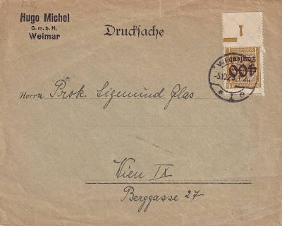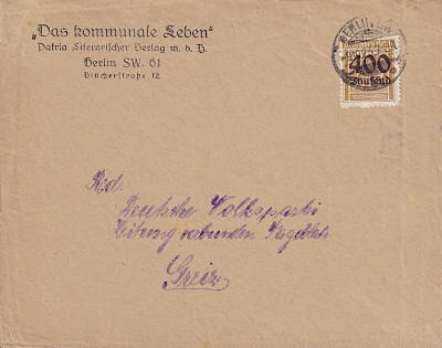 Foreign printed matter (1-25 g) from 05.10.1923 (19. Period) franked with one stamp a 400 000 Mark on 25 Pfennig (=400 000 Mark); to Austria the inland fee was valid |