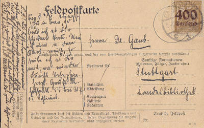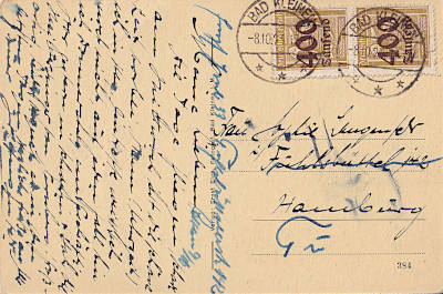 Local postcard from 05.10.1923 (19. Period) franked with one stamp a 400 000 Mark on 25 Pfennig (=400 000 Mark) |