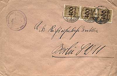 Local cover (21-100 g) from 06.10.1923 (19. Period) franked with 3 stamps a 400 000 Mark on 25 Pfennig (=1,2 Million Mark) |