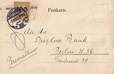 Local postcard from 02.10.1923 (19. Period) franked with one stamp a 400 000 Mark on 30 Pfennig (=400 000 Mark)