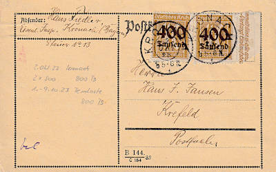 Inland book order (1-25 g) from 06.10.1923 (19. Period) franked with one stamp a 400 000 Mark on 40 Pfennig (=400 000 Mark) |