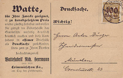 Inland printed matter (1-25 g) from 09.10.1923 (19. Period) franked with one stamp a 400 000 Mark on 40 Pfennig (=400 000 Mark) |
