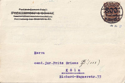 Inland postcard from 04.10.1923 (19. Period) franked with one stampe a 800 000 Mark on 400 Mark (=800 000 Mark)
