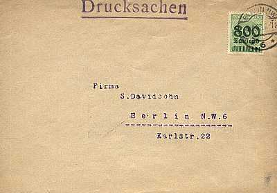 Inland printed matter (26-50 g) from 04.10.1923 (19. Period) franked with one stamp a 800 000 Mark on 400 Mark(=800 000 Mark)