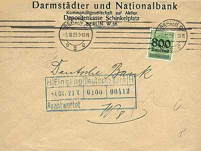 Local cover (1-20 g) from 03.10.1923 (19. Period) franked with one stamp a 800 000 Mark on 400 Mark (=800 000 Mark)
