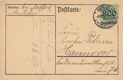 Inland postcard from 08.10.1923 (19. Period) franked with one stamp a 800 000 Mark on 400 Mark (=800 000 Mark)