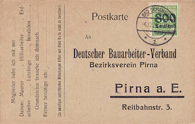 Inland postcard from 04.10.1923 (19. Period) franked with one stamp a 800 000 Mark on1 000 Mark (=800 000 Mark)