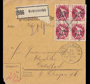 Inland parcel card (2 500 g, < 75 km) from 13.09.1921 (6. Period) franked with 4 stamps a 75 Pfennig (=3 Mark)