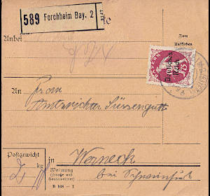 Inland parcel card (2 000 g, < 75 km) from 23.04.1920 (4. Period) franked with one stamp a 75 Pfennig (=75 Pfennig)