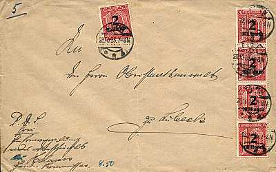 Inland cover (1-20 g) from 28.10.1923 (21. Period) franked with 5 stamps a 2 Million Mark on 10 Pfennig (=10 Million Mark)