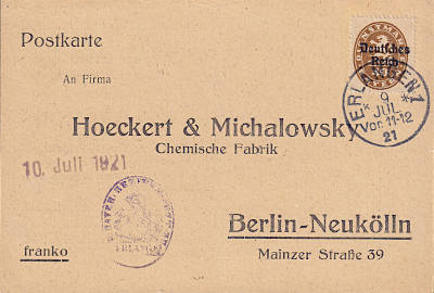 Inlandspostkarte vom 09.07.1921 (6. Periode) frankiert mit einer Marke a 40 Pfennig (=40 Pfennig) |