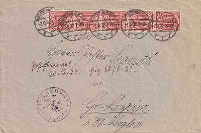 Inlandsbrief (1-20 g) vom 07.06.1922 (7. Periode) frankiert mit 5 Marken a 40 Pfennig (=2 Mark) |