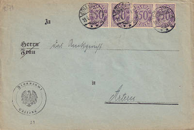 Inlandsbrief (1-20 g) vom 19.06.1922 (7. Periode) frankiert mit 4 Marken a 50 Pfennig (=2 Mark) |