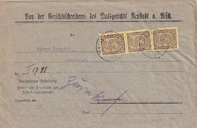 Inlandsbrief mit Zustellungsurkunde (1-20 g) vom 09.11.1922 (9. Periode) frankiert mit 3 Marken a 5 Mark (=15 Mark, 6 Brief 3 Zustellung 6 Urkunde) |