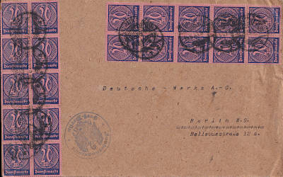 Inlandsbrief (1-20 g) vom 23.04.1923 (13. Periode) frankiert mit 5 Marken a 20 Mark (=100 Mark) |