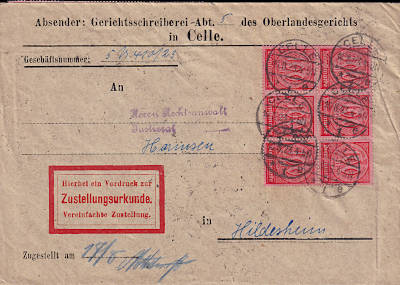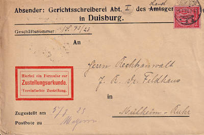 Inlandsbrief mit Zustellungsurkunde (1-20 g) vom 04.07.1923 (14. Periode) frankiert mit 9 Marken a 100 Mark (=900 Mark, 300 Brief 300 Zustellung 300 Urkunde) |
