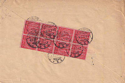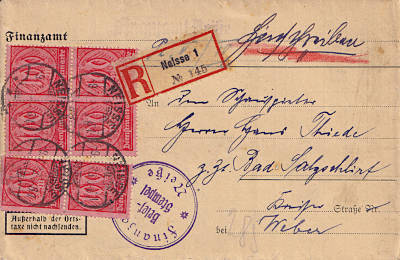Inlandsbrief mit Einschreiben (1-20 g) vom 09.07.1923 (14. Periode) frankiert mit 6 Marken a 100 Mark (=600 Mark, 300 Brief 300 Einschreiben) |