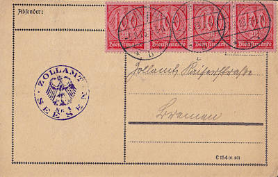 Inlandspostkarte vom 03.08.1923 (15. Periode) frankiert mit 4 Marken a 100 Mark (=400 Mark) |