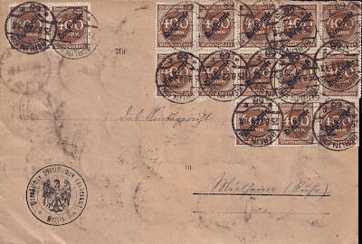 Local cover (1-20 g) from 11.09.1923 (17. Period) franked with 75 stamps a 400 Mark(=30 000 Mark)