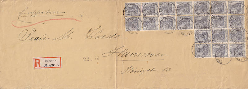 Inlandsbrief mit Einschreiben (21-250 g) vom 26.03.1908 (1. Periode) frankiert mit 20 Marken a 2 Pfennig (=40 Pfennig, 20 Brief 20 Einschreiben)