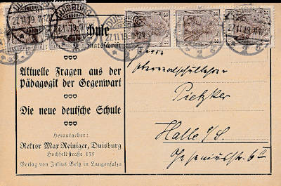 Inland postcard from 27.11.1919 (4. Period) franked with 5 stamps a 3 Pfennig(=15 Pfennig)