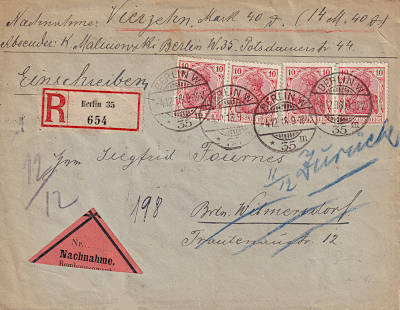 Ortsbrief mit Einschreiben und Nachnahme (1-20 g) vom 04.12.1918 (3. Periode) frankiert mit 4 Marken a 10 Pfennig (=40 Pfennig, 10 Brief 20 Einschreiben 10 Nachnahme) |